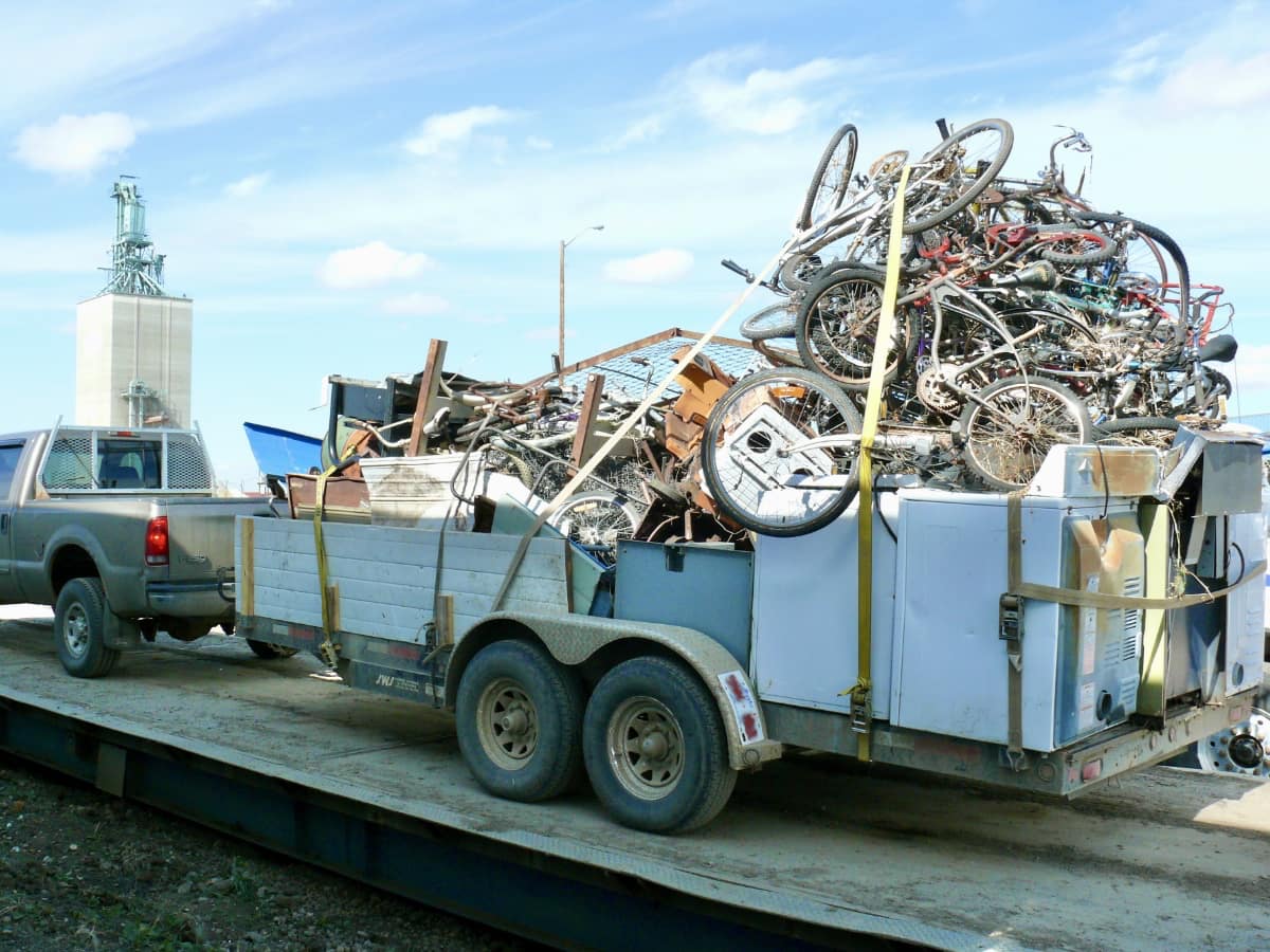 A large pile of scrap bicycles on a flat deck trailer. The bicycles are stacked on top of broken laundry machines. The is a bunch of other scrap metal piled up on the trailer and everything is strapped down.